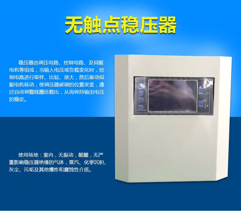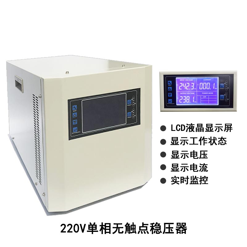 单相智能无触点稳压器系我公司自行研制开发、生产的一款高端产品。 智能无 触点稳压器采用集成电路按特定顺序控制若干个晶闸管电压过零通断,来改变补偿电压的大小与极性,是晶闸管交流开关技术与变压器技术的完美结合。采用晶闸管(可控硅)代替机械与碳刷来控制调压,是引领大功率电力稳压器发展方向的先进产品,是节能型绿色环保产品,具备所有保护功能,工作十分可靠,适应性特强。实现了全无触点调压,具有稳定性能好,效率特高,精度高等优点.