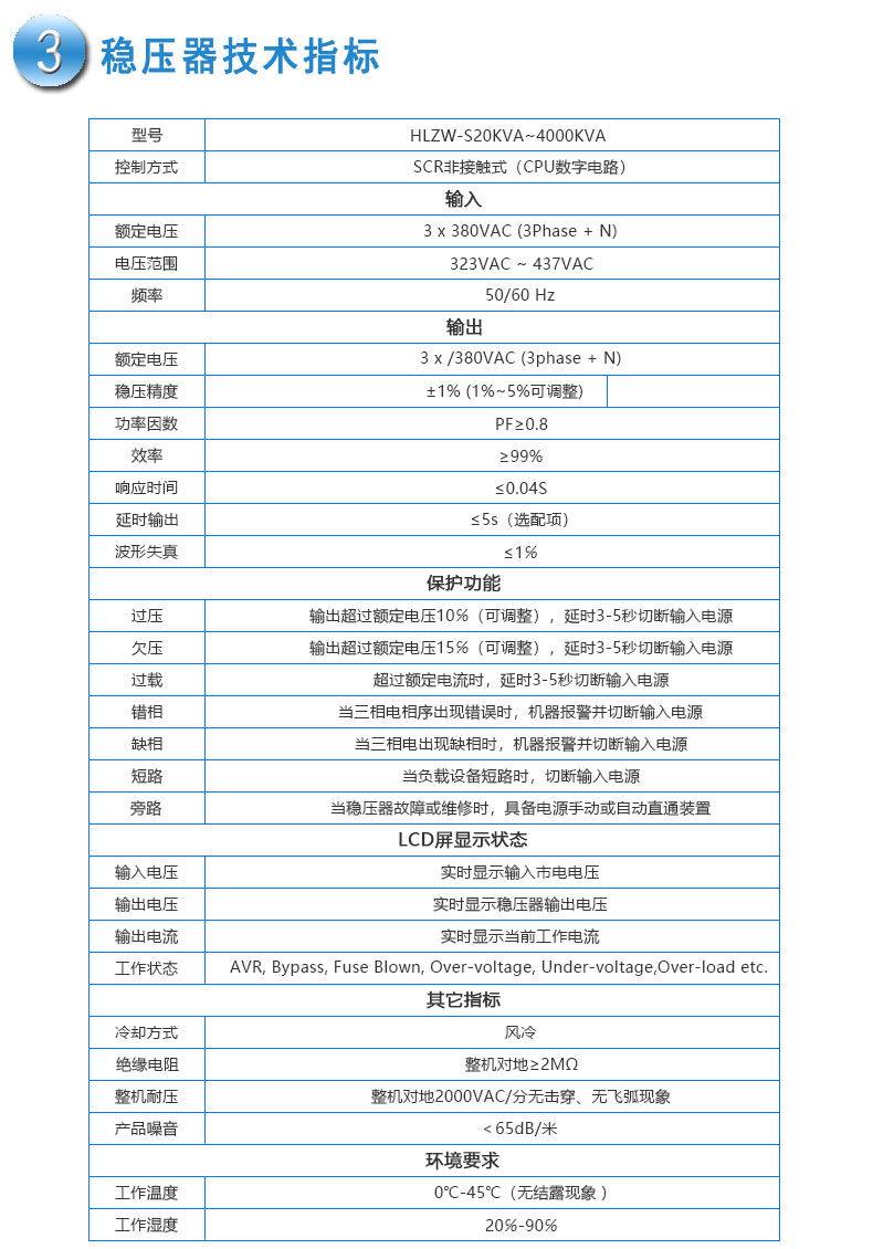 稳压速度快至40ms,整机无触点、抗干扰、无机械故障和碳刷磨损,免维护。三相电压独立调压,输出电压平衡。有效保护精密设备用电安全。