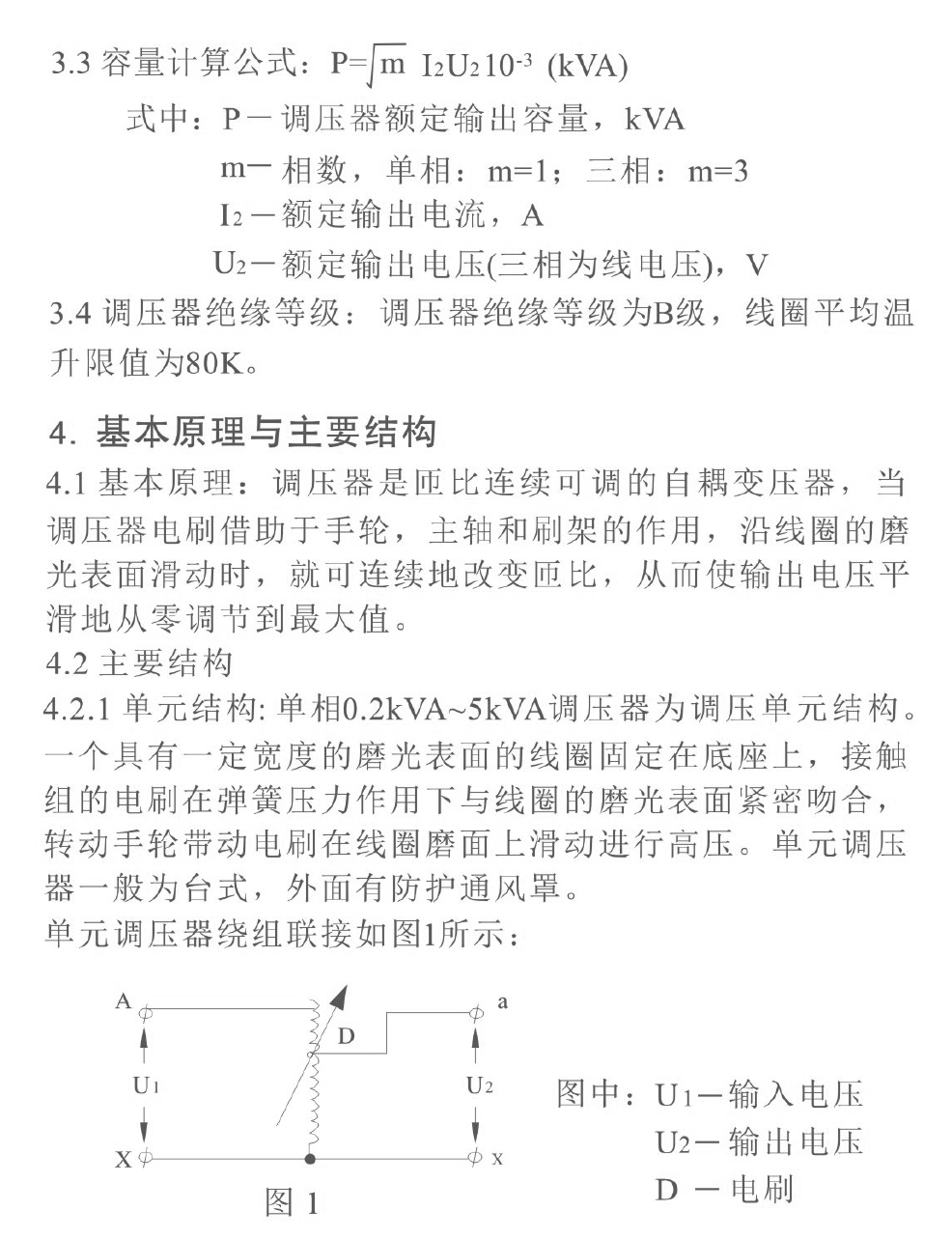 调压器系一种可调的自耦变压器,调压器由3只线包组成,在环形铁心上均匀地绕制着线圈,由伺服电机带动碳刷来回调动,接触组的电刷在弹簧的压力作用下与线圈的磨光表面紧密吻合,转动转轴带动刷架使电刷沿着线圈的表面滑动,改变电刷接触位置,可使在输出电压调节范围获得平滑无极调节。