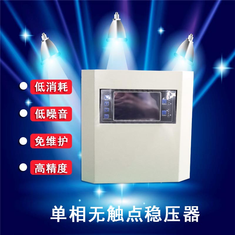 单相智能无触点稳压器系我公司自行研制开发、生产的一款高端产品。 智能无 触点稳压器采用集成电路按特定顺序控制若干个晶闸管电压过零通断,来改变补偿电压的大小与极性,是晶闸管交流开关技术与变压器技术的完美结合。采用晶闸管(可控硅)代替机械与碳刷来控制调压,是引领大功率电力稳压器发展方向的先进产品,是节能型绿色环保产品,具备所有保护功能,工作十分可靠,适应性特强。实现了全无触点调压,具有稳定性能好,效率特高,精度高等优点.